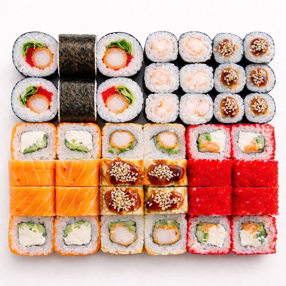 Филадельфия, Дракон, Калифорния с лососем, Эби маки, Унаги маки, Катана. Доставляется с соевым соусом и палочками.