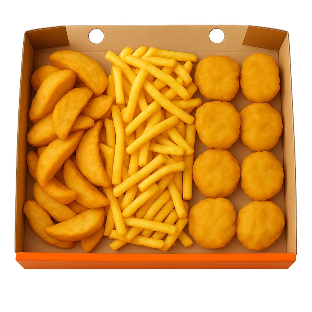 Всего по два и даже больше. 2 вида ароматного картофеля - Айдахо и фри, 2 соуса Хайнц на выбор и аппетитные наггетсы