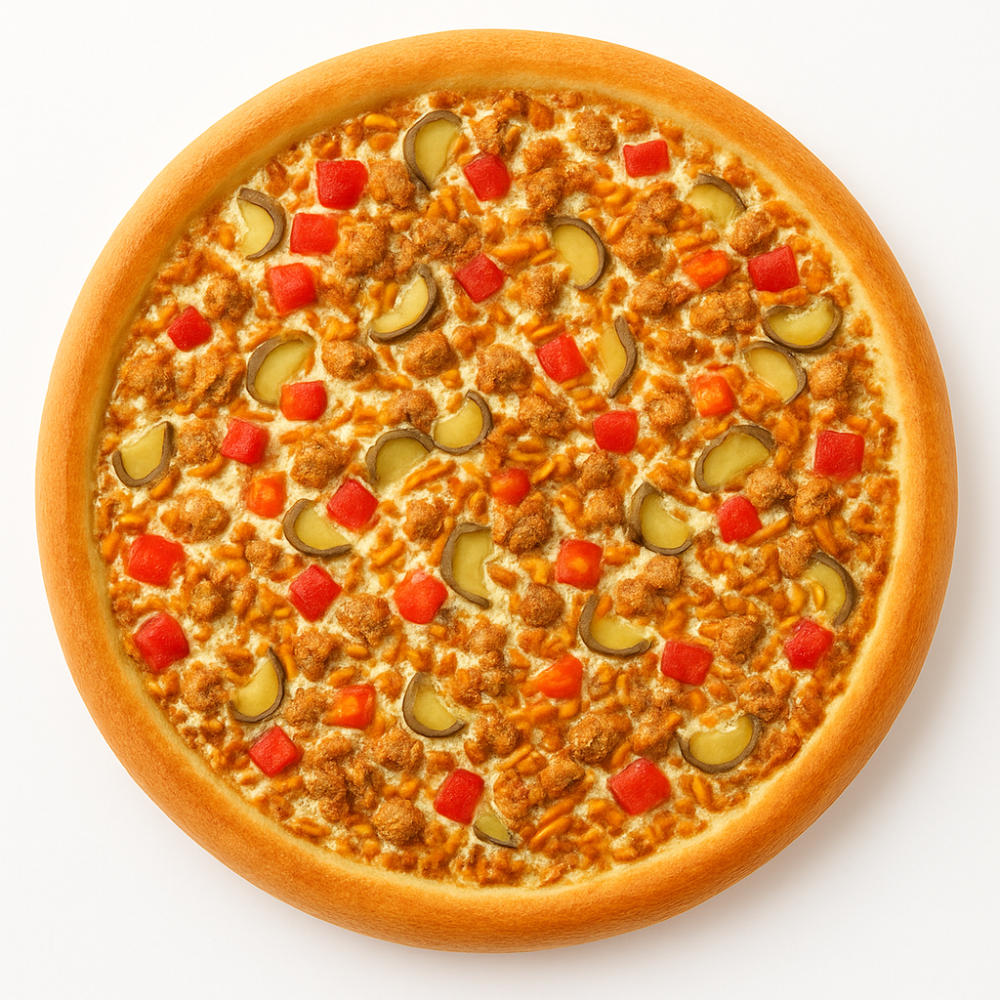Свинина запеченная, филе куриное запеченное, корнишоны, томаты, лук жареный, моцарелла, соус перечный