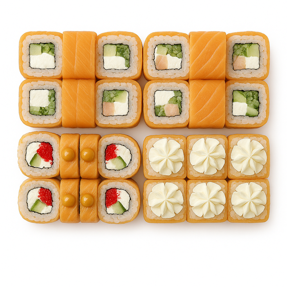 Филадельфия, Филадельфия с коп.лососем, Филадельфия с креветкой, Запеченная Филадельфия. Доставляется с соевым соусом и палочками.