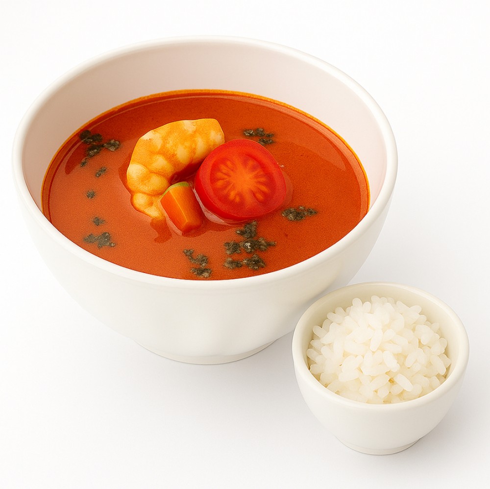 Креветки тигровые, томаты черри, шампиньоны, кокосовое молоко, паста Том Ям, лайм, кинза
