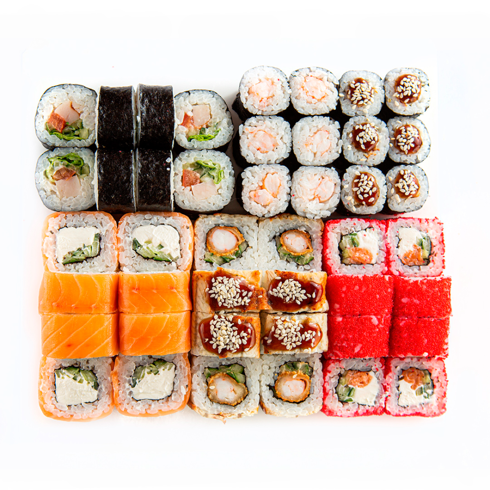 Филадельфия, Цезарь, Дракон, Калифорния с лососем, Эби маки, Унаги маки. Доставляется с соевым соусом и палочками.