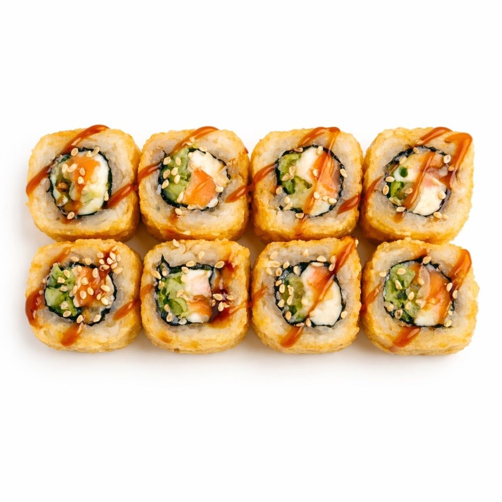 Кура копченая, огурец, сливочный сыр, соус унаги, сухари Панко, кунжут. Доставляется с соевым соусом и палочками.
