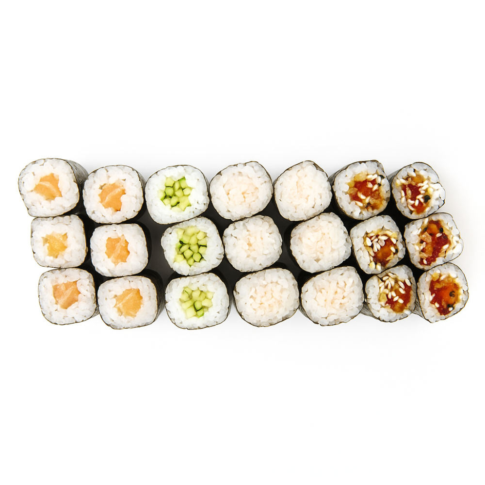 Сяке маки, Эби маки, Каппа маки, Унаги маки. Доставляется с соевым соусом и палочками.