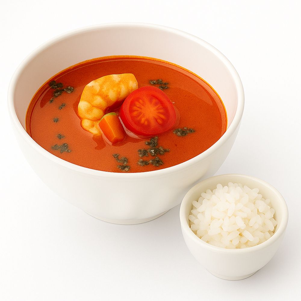 Креветки, томаты черри, шампиньоны, кокосовое молоко, паста Том Ям, лайм, кинза, рис