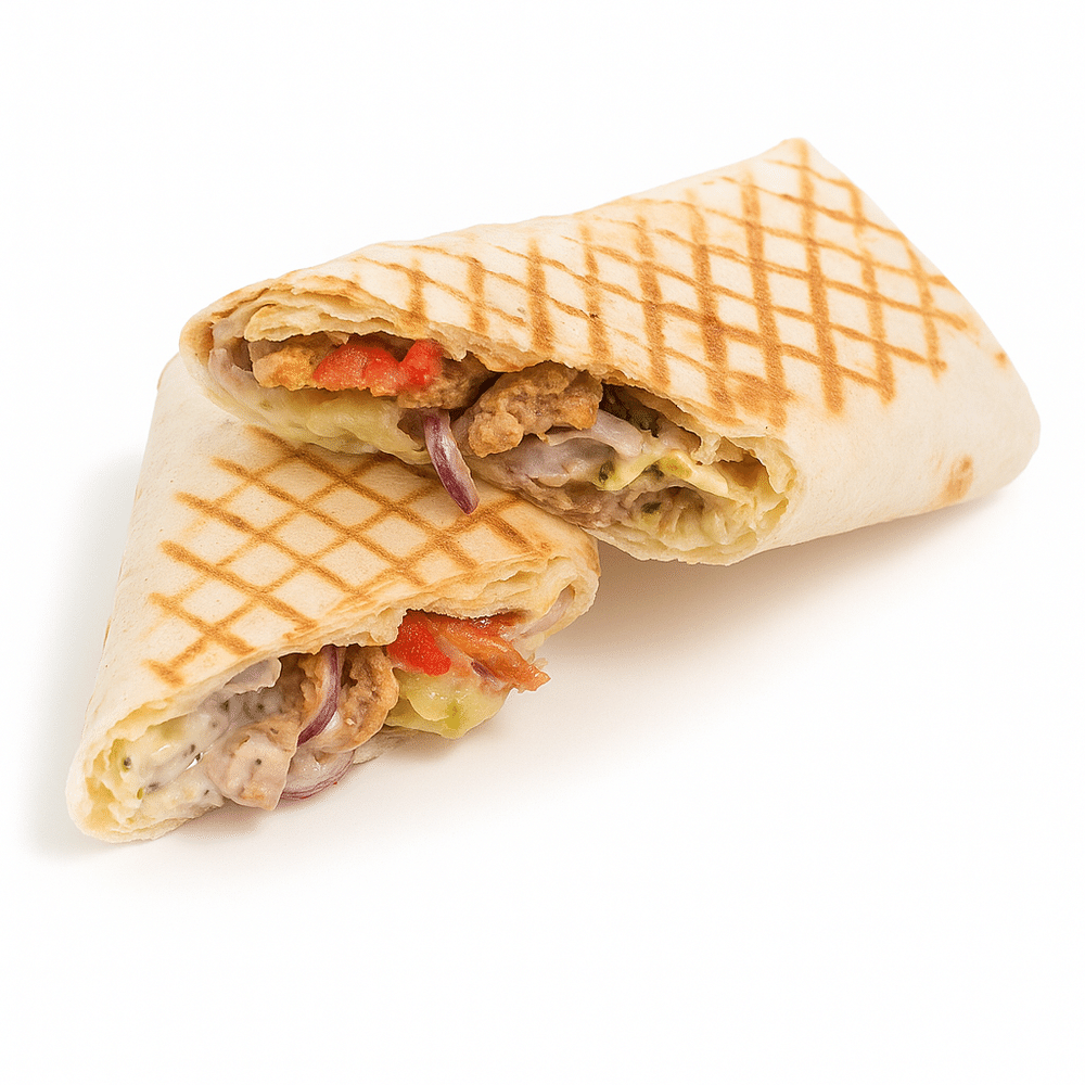Лаваш, филе куриное, салат айсберг, томаты, огурцы свежие, лук красный, соус