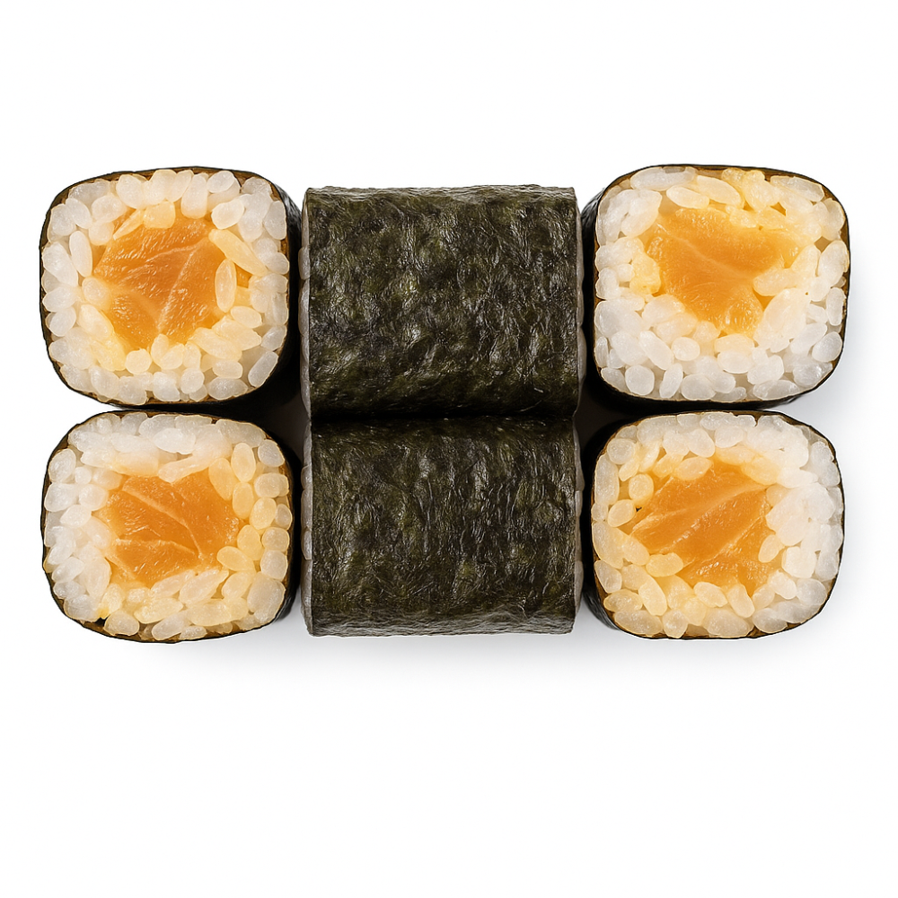 Лосось, рис, нори, спайс соус. Доставляется с соевым соусом и палочками.