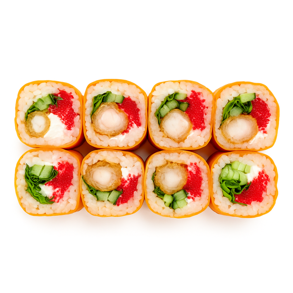 Креветка темпура, огурец свежий, сливочный сыр, лист салата, масаго,маменори . Доставляется с соевым соусом и палочками.