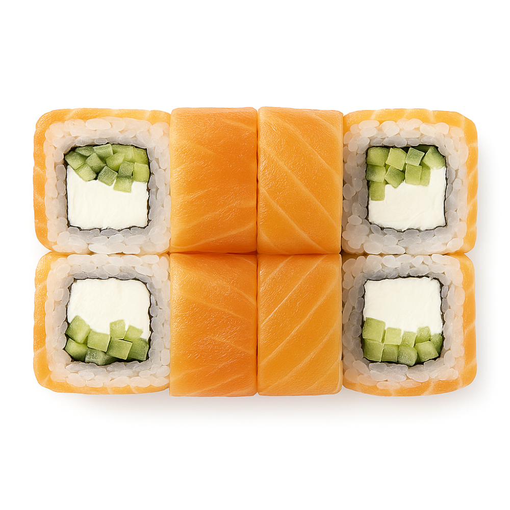 Лосось, огурец, сливочный сыр. Доставляется с соевым соусом и палочками.