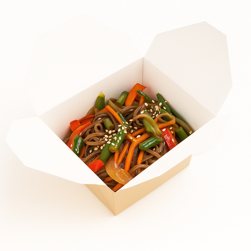 Лапша соба, перец болгарский, морковь, фасоль стручковая, кунжут, соус терияки, соевый соус