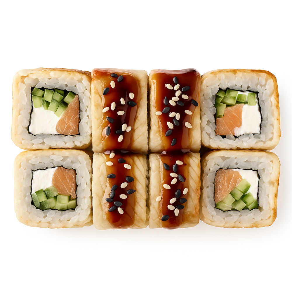 Копчёный угорь, лосось, сливочный сыр, свежий огурец, соус унаги, кунжут. Доставляется с соевым соусом и палочками.