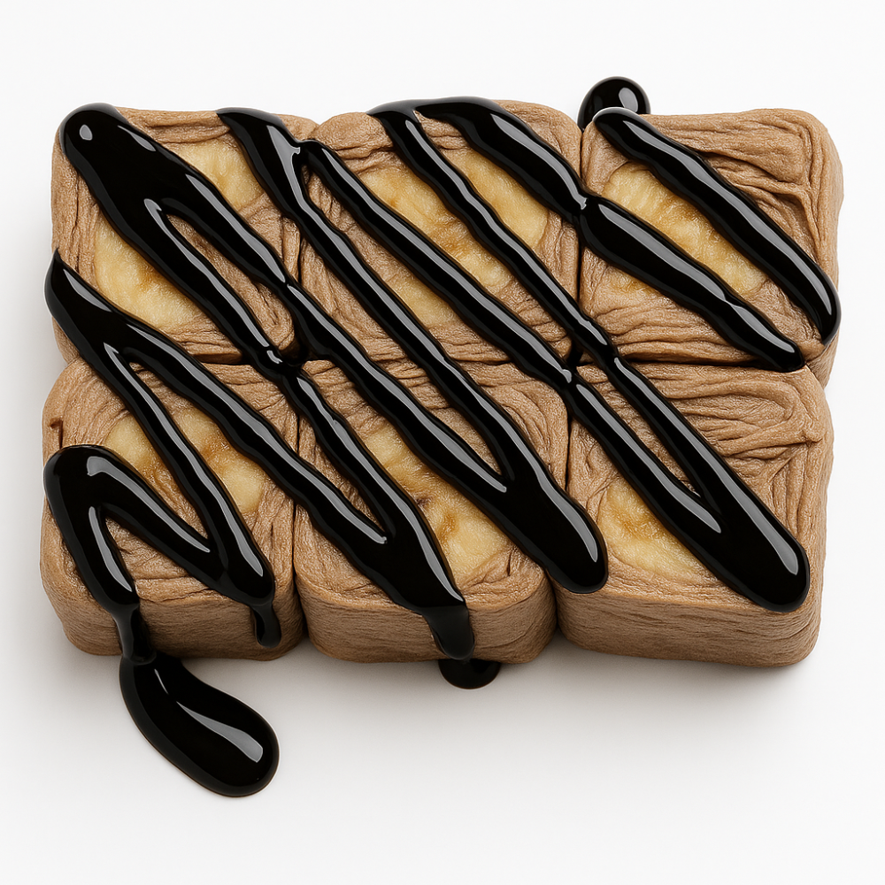 Банан, сыр Креметто, топпинг шоколадный, сахарная пудра, спринг тесто