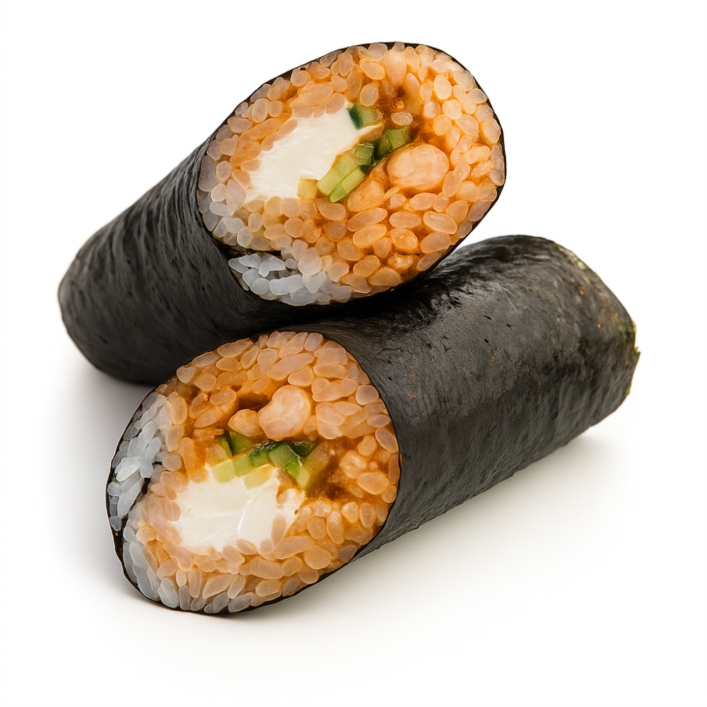 Креветки тигровые вареные, рис, нори, огурец свежий, сыр сливочный, соус Том Ям, соевый соус