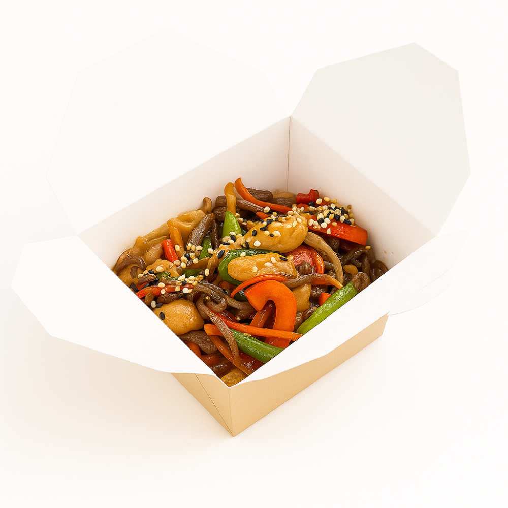 Лапша соба, куриное филе, морковь, болгарский перец, фасоль стручковая, кунжут, соус Терияки, соевый соус