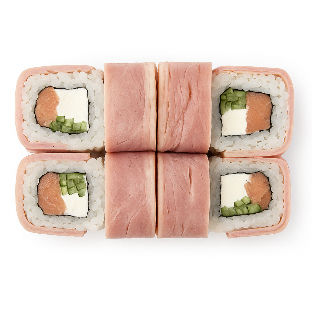 Лосось х\к, бекон в\к, огурец, лук зеленый, сливочный сыр. Доставляется с соевым соусом и палочками.