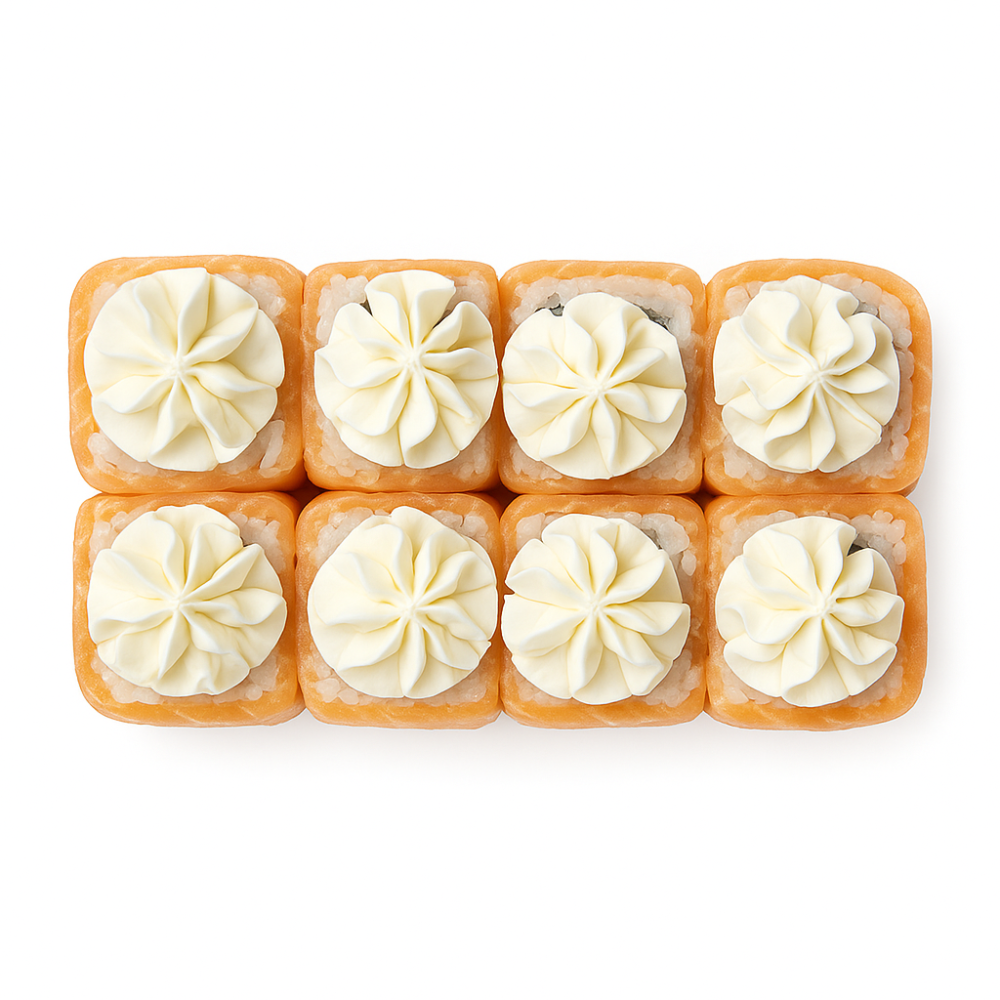 Лосось, креветка вареная, сливочный сыр, огурец. Доставляется с соевым соусом и палочками.