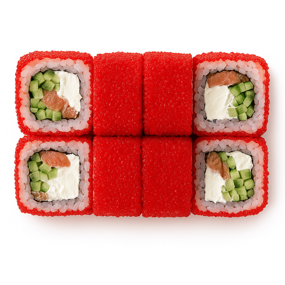 Лосось, свежий огурец, сливочный сыр, масаго. Доставляется с соевым соусом и палочками.