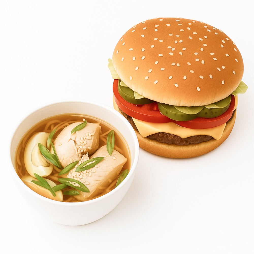 Америка и Азия в одном наборе. Бургер с сочной говяжьей котлетой и насыщенный Рамен с лапшой и топпингом.