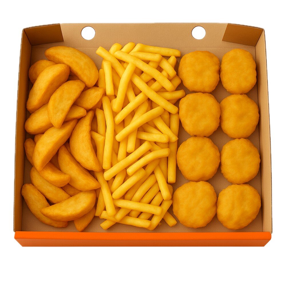 Всего по два и даже больше. 2 вида ароматного картофеля - Айдахо и фри, 2 соуса Хайнц на выбор и аппетитные наггетсы
