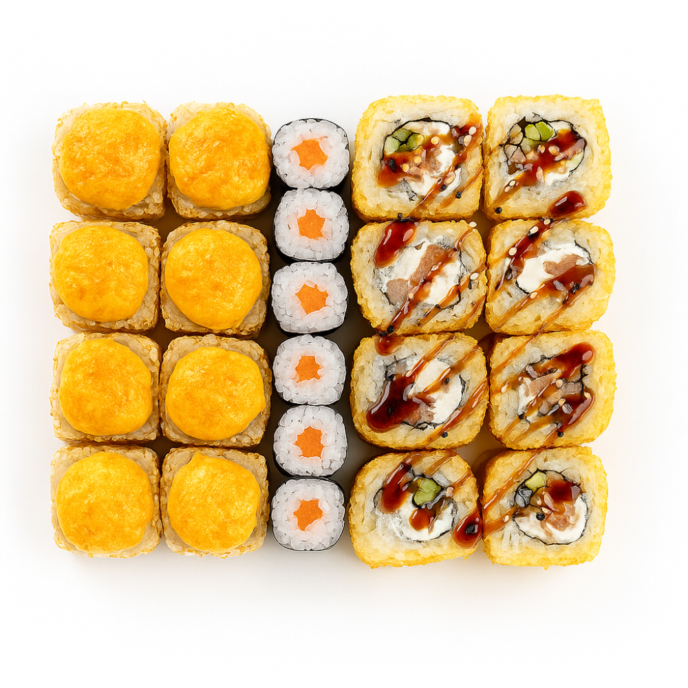 Сырный лосось, Филадельфия темпура, Сяке маки. Доставляется с соевым соусом и палочками.