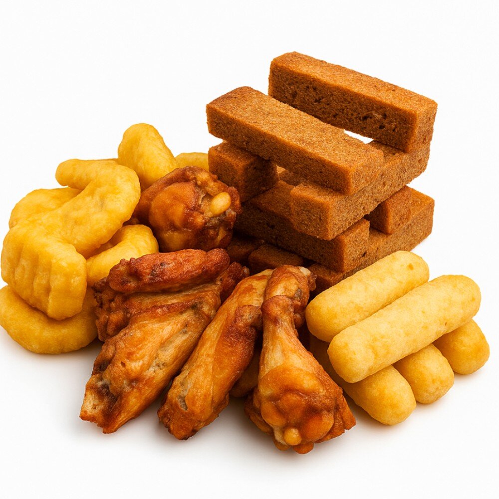 Возьми к пенному. Хрустящие гренки, наггетсы, ароматные куриные крылышки, поджаренный сыр и три отличных соуса - кисло-сладкий, барбекю и сливочно-чесночный.