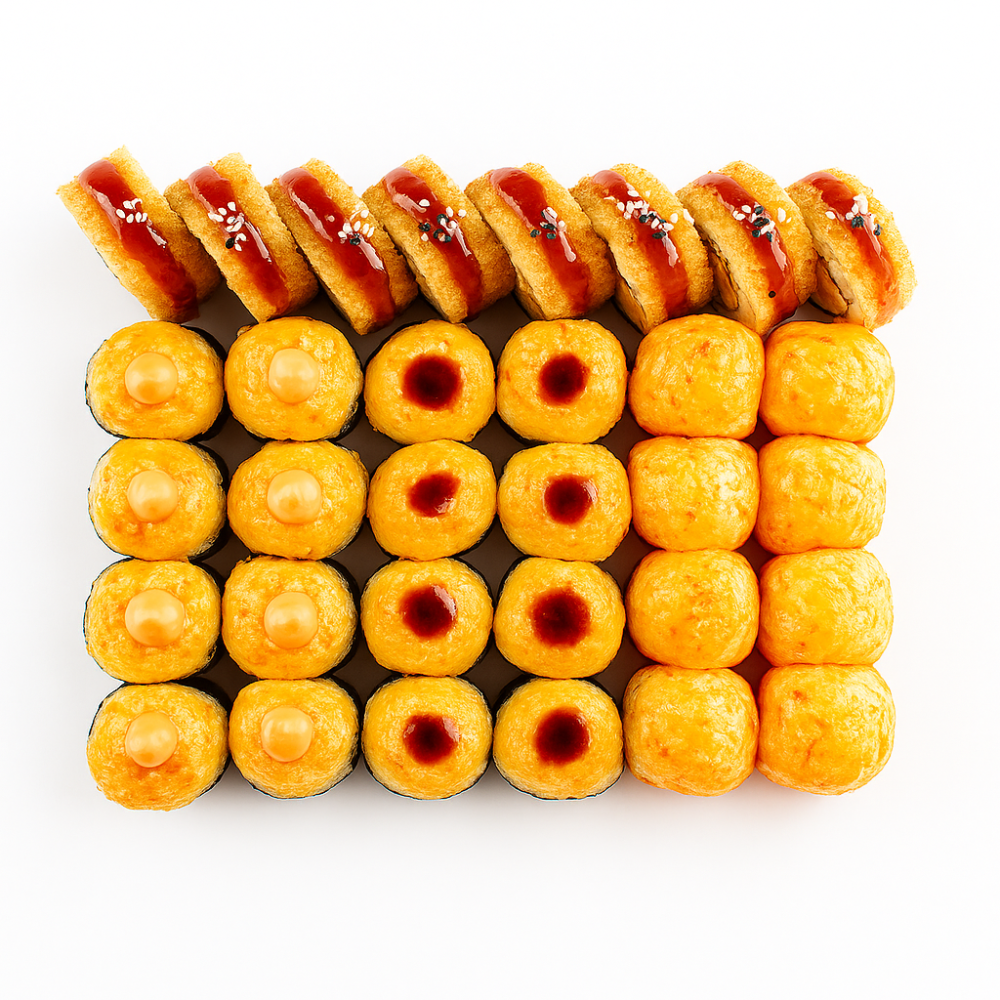 Филадельфия темпура, Запеченный ролл с лососем, Креветка спайси, Чикен барбекю. Доставляется с соевым соусом и палочками.
